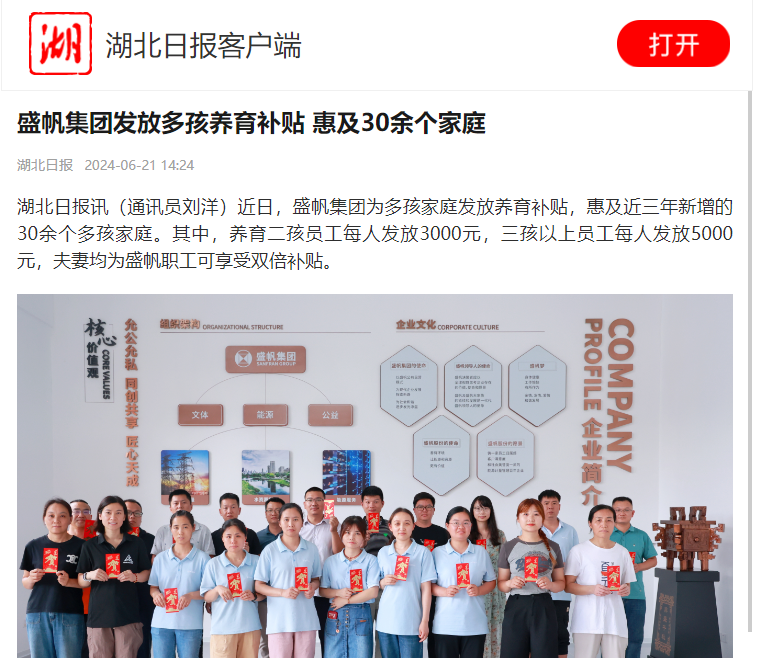 湖北日报讯(通讯员刘洋)近日,盛帆集团为多孩家庭发放养育补贴,惠及近三年新增的30余个多孩家庭。其中,养育二孩员工···