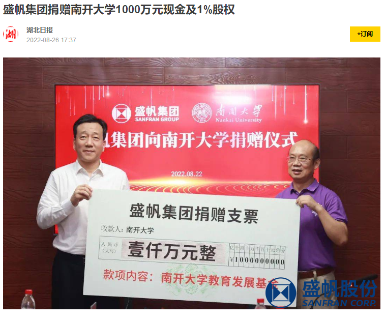 8月22日,盛帆集团与南开大学在武汉签署捐赠协议,盛帆集团向南开大学捐赠1000万元现金和1%股权,双方开启深度合作。盛帆···