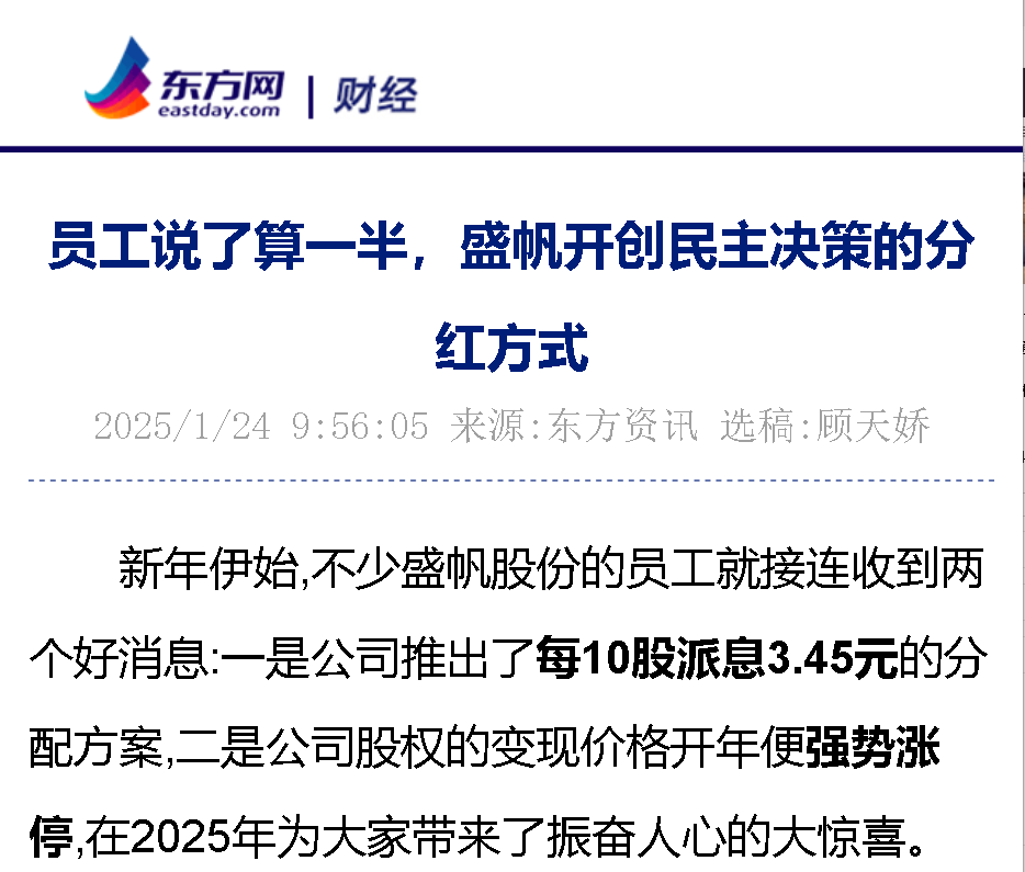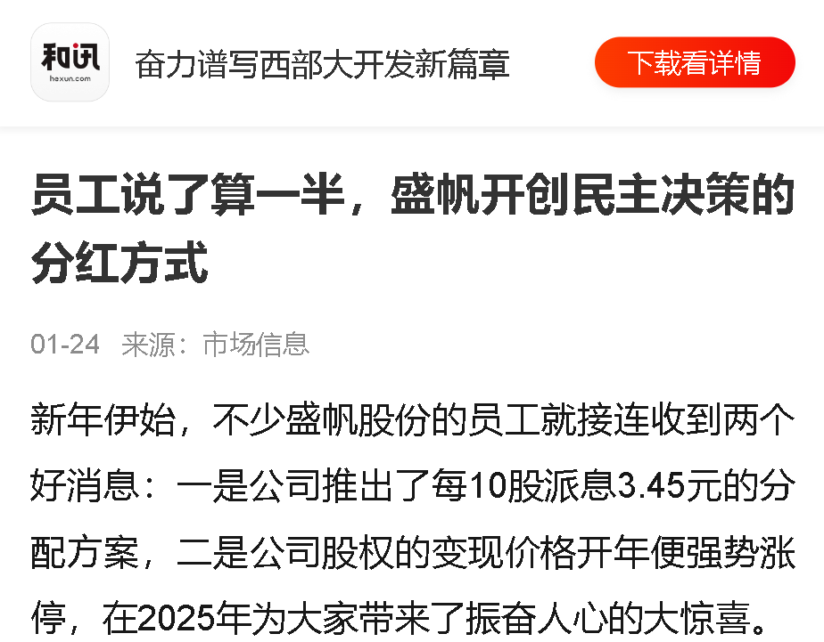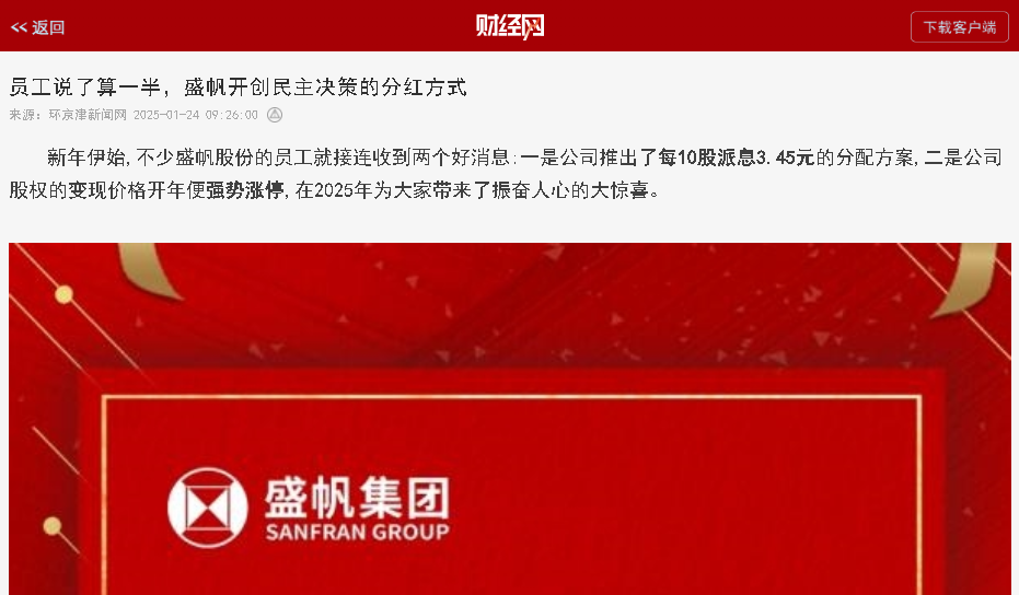 新年伊始,不少盛帆股份的员工就接连收到两个好消息:一是公司推出了每10股派息3.45元的分配方案,二是公司股权的变现价格开···