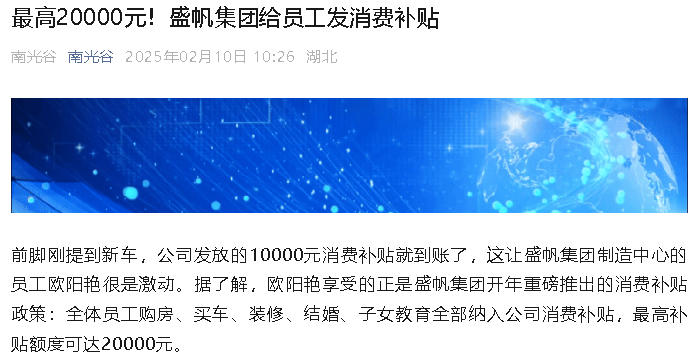 前脚刚提到新车,公司发放的10000元消费补贴就到账了,这让盛帆集团制造中心的员工欧阳艳很是激动。据了解,欧阳艳享受的···
