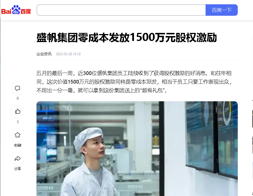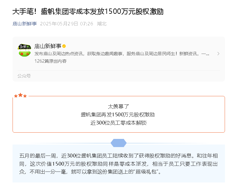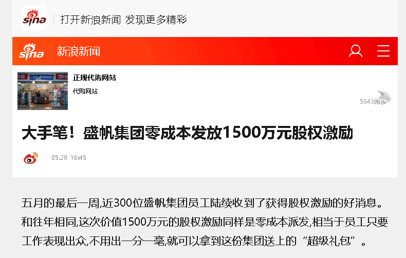 五月的最后一周,近300位盛帆集团员工陆续收到了获得股权激励的好消息。和往年相同,这次价值1500万元的股权激励同样是零···